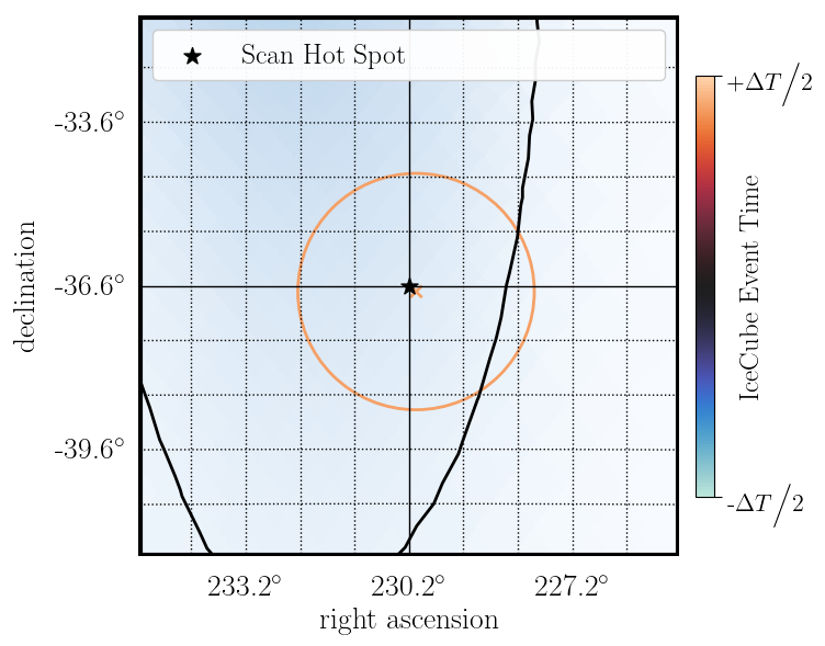 Most probable direction: | RA: 230.19 deg, decl.: -36.61 deg |