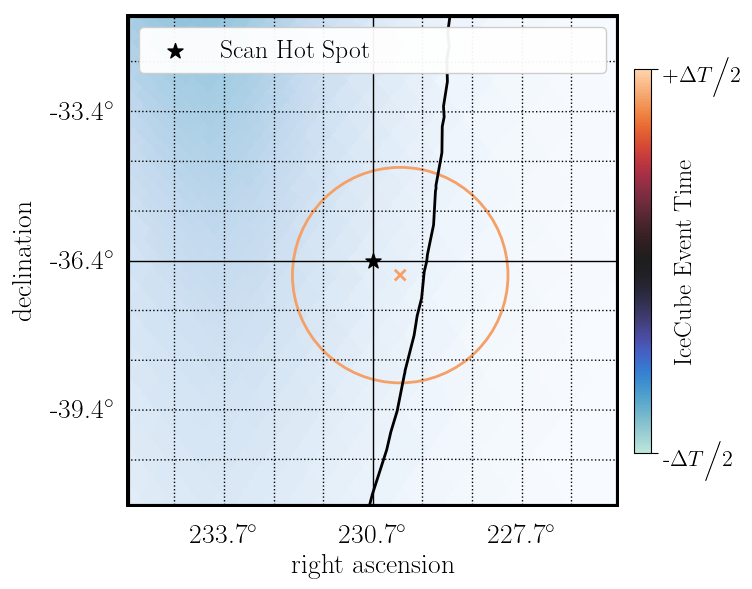 Most probable direction: | RA: 230.71 deg, decl.: -36.42 deg |