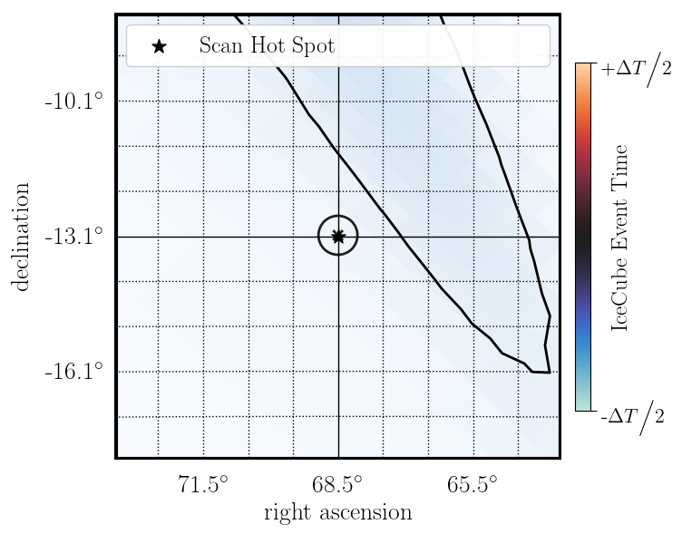 Most probable direction: | RA: 68.47 deg, decl.: -13.09 deg |