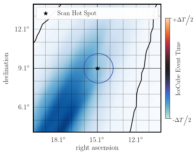 | Most probable direction: | RA: 15.12 deg, decl.: 9.06 deg |